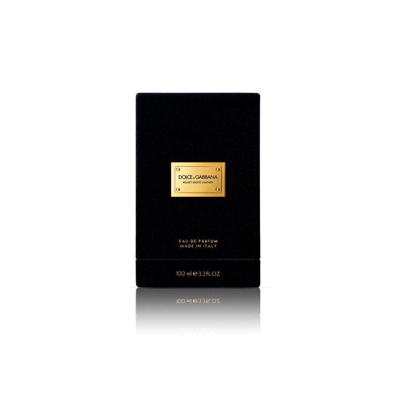 The iconic, weighty glass flacon of the Dolce&Gabbana Velvet Collection is topped with a warm brown velvet-trimmed stopper with golden accents. The flacon of Dolce&Gabbana Velvet Exotic Leather Eau de Parfum is also personalized with an engraved golden plate, and comes encased in a black velvet coffret.